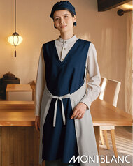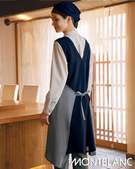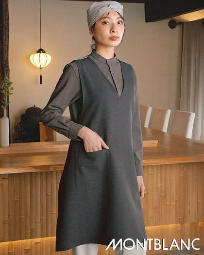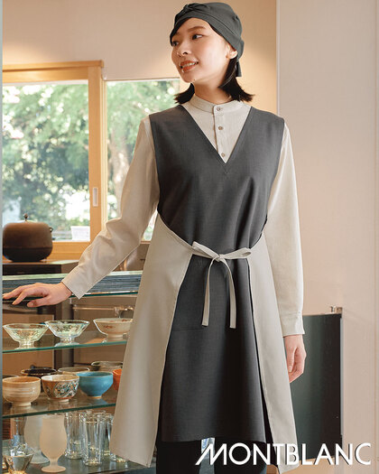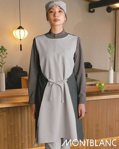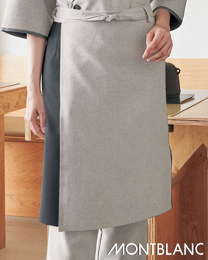 奥行きのある杢調素材に、意匠を凝らしたデザインのエプロンです。前後で形状の異なる衿デザイン、腰回りのラップ式合わせを前後で結べる珍しいタイプ。織物素材の《ワルツマットストレッチ》は、扱いやすいポリエステルですが、見た目と風合いを天然素材に近づけた和素材。杢調でテカリのないマット感があり、無地でも奥行きのある色彩が特長です。ポリエステル100%。吸汗速乾・ストレッチ素材。