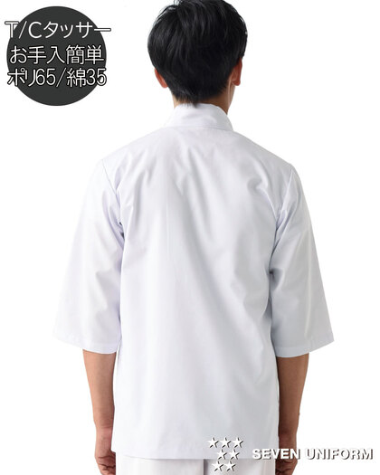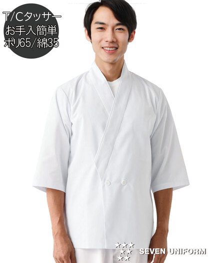 通常の白衣よりもきもち厚めのタッサー生地を使用した、七分袖のはっぴスタイル調理衣です。左胸内ポケット、左腰ポケット、両裾スリット入り。織物素材の《タッサー》はナチュラルな肌触りと耐久性を高めた定番素材。伸びにくく、シワにも強いのでデイリーユースにお勧めです。太目の経糸を密に織り込み横方向に畝があり、表面には微かな凹凸感がありますSEK(橙)制菌加工。