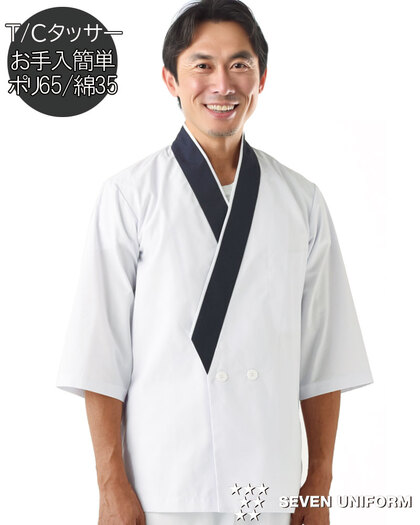 調理用白衣の中から、動きやすさとシンプルな機能美を追求した法被タイプの調理衣のご紹介。高級店から大衆店まで広く採用される調理白衣の定番です。素材は動きやすさと取り扱いやすさを重視した薄手のポプリン素材が中心。
