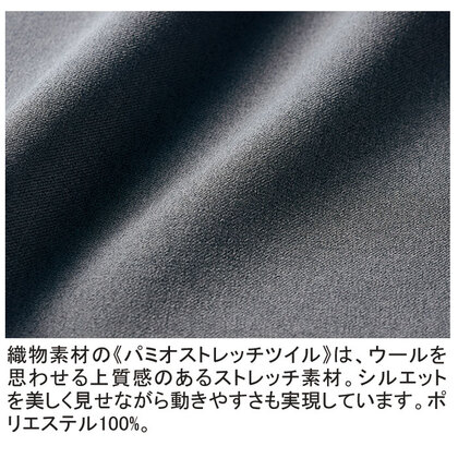 使い勝手のいい万能カラー、すっきりシルエット&ローライズのスカートです。裏地付き、両脇ポケット付き。織物素材の《パミオストレッチツイル》は、ウールを思わせる上質感のあるストレッチ素材。細身のシルエットを美しく見せながら動きやすさも実現しています。ポリエステル100%。
