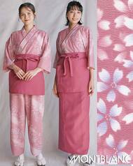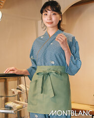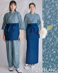 和のおもてなしを手軽に演出♪ 和服を一人でも簡単に着用できる仕事着にアレンジした、上下セパレートの制服です。シボ感のあるちりめん素材に、伝統柄の桜吹雪、吉祥七宝、椿唐草をあしらわれています。上は茶衣着、下はパンツかスカートを組合わせ、用途に合わせて前掛を着用頂きます。和装の美しさと、仕事着のお手入れのしやすさを両立した商品♪織物素材の《ちりめんプリント》はポリエステル100%のイージーケア素材。