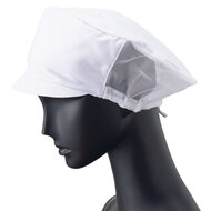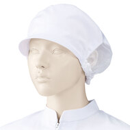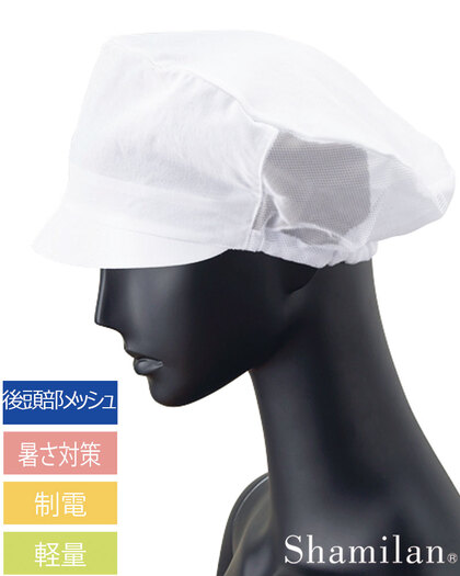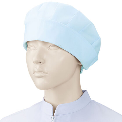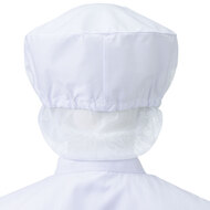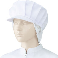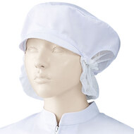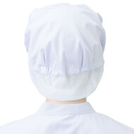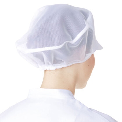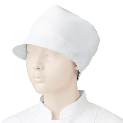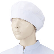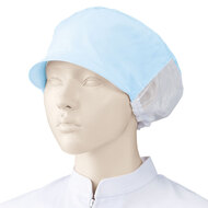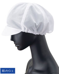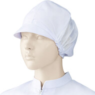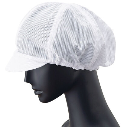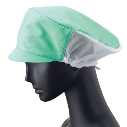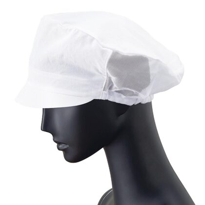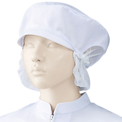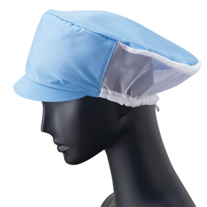 食品工場で使用されるキャスケットタイプの女性用の衛生帽子。着脱が簡単で、対面販売にも適した、軽作業向けの帽子です。毛髪落下を防止するメッシュケープなどの基本性能を備えています。