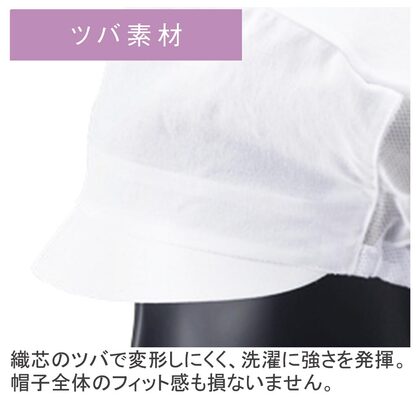 深めのかぶりで後頭部までしっかり覆える帽子です。ツバ:織芯、後ろ:アジャスター調整。平織素材の《制電ポプリン》は、衛生管理に対応した機能性素材。塩素系漂白剤による退色を防止する《フェードガードCℓ》加工・撥水撥油成分による高性能防汚《撥油SR》加工・制電・形態安定素材。