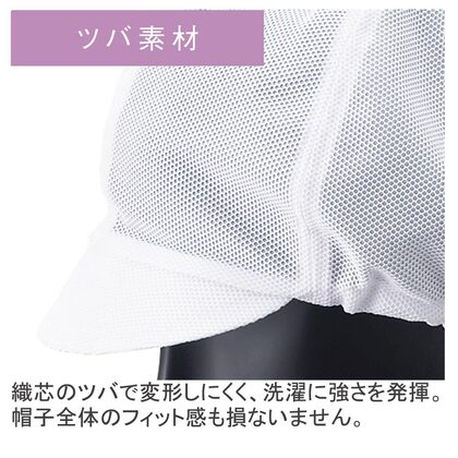 ツバ以外をメッシュ素材にした通気性第一の衛生帽子です。ツバ/織芯、後ろサイズ調整/引出ゴム仕様。ポリエステル100%のソフトメッシュ(細目)を本体生地に使用しています。