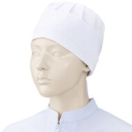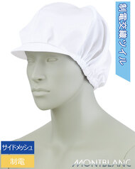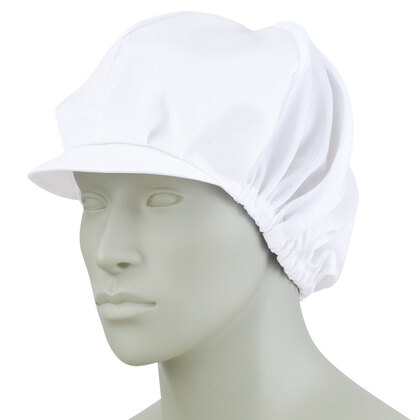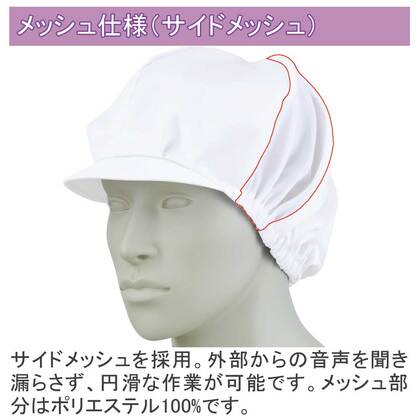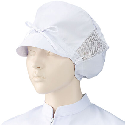 食品工場で使用されるキャスケットタイプの女性用の衛生帽子。着脱が簡単で、対面販売にも適した、軽作業向けの帽子です。毛髪落下を防止するメッシュケープなどの基本性能を備えています。