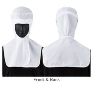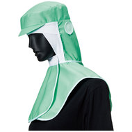 頭部をぐるっと囲むハチマキ型のロングフードです。肌に触れるだけでヒンヤリ感のある本体のアクアクール素材、ぴったりフィットする顔まわりの伸縮性素材、本体と同素材のケープ仕様。ツバ/織芯、額部素材/T400、前スナップボタン、マスク掛け/円掛け式、メガネさし/スリット式、後頭部/スナップボタン、立体ケープ素材/共布。
