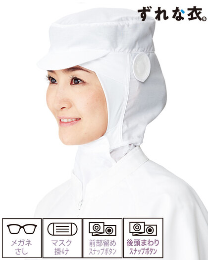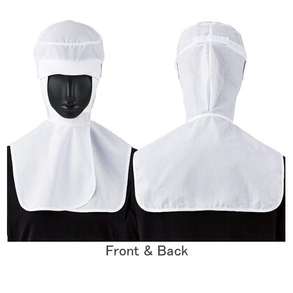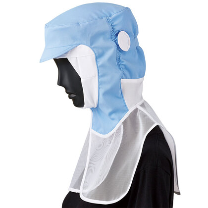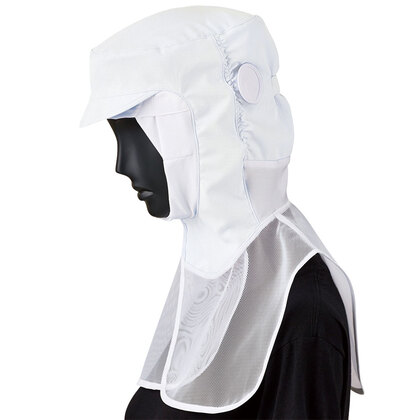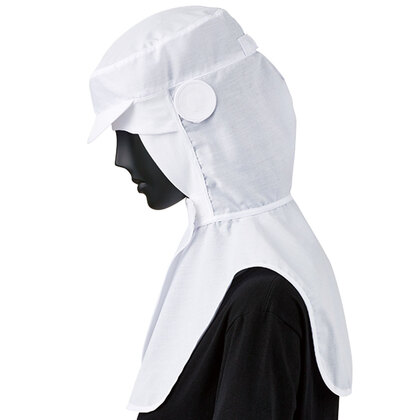 食品工場で使用されるケープ付きの衛生帽子。毛髪混入対策に特化した、食品工場全般に適したタイプ。首から胸にかけてケープが付いているので、毛髪の落下防止をより強化した形状が特長です。