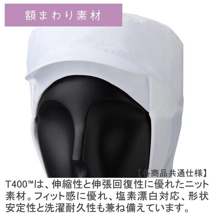 視界の広がるつば無し&毛髪落下効果を強化するかぶり型のロングフード。ドラタッチで肌離れが良く涼やかなSUZUMI DRYを使用しています。汗をかきやすい首まわりは、クーリング効果のあるUCHIMIZU DRYダブルニットメッシュの快適仕様です。顔周り素材/T400、首部素材/ダブルニットメッシュ、マスク掛け/円掛け式、メガネさし/はさみ式、後頭部/ゴム入り、立体ケープ素材/共布・メッシュ。