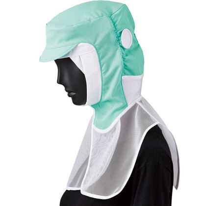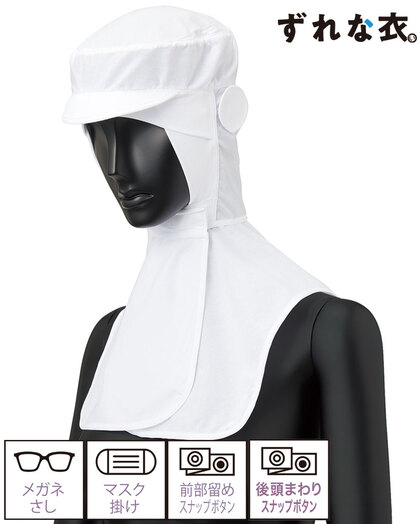 マスク掛けを省いたロングフードです。肌に触れるだけでヒンヤリ感のある素材アクアクールを本体に使用しています。ツバ/織芯、顔まわり素材/テクノファイン、前スナップボタン、メガネさし/スリット式、後頭部/マジックテープ、立体ケープ素材/共布。