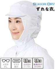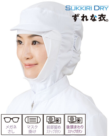 広めの額部分で眉毛の落下防止を強化、涙型の頭頂部裁断パターンで頭部の密着度を高め毛髪落下防止を強化した、かぶり型のロングフード。いつまでも続く、ドライでサラッとした肌触りのSUKKIRI DRYを使用しています。ツバ/織芯、顔周り素材/T400、首後ろ素材/テクノファイン、マスク掛け/円掛け式、メガネさし/はさみ込み式、後頭部/ゴム調整、立体ケープ素材/メッシュ。