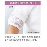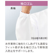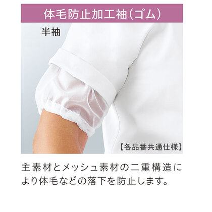 薄手で涼しく、しっかりとした綿混定番素材を使用した女性用衛生ジャンバーです。着丈の長いチュニックタイプ。常温環境から高温多湿での作業に適しています。裾脇ゴムなし、袖口ネット、左胸内ポケット付き(マジックテープ留め)。