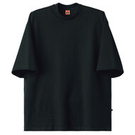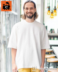 厚くしっかりしたジャージー生地のゆったりクルーネックTシャツ。首回りは品格を保つ詰まったデザイン、生地は身体のラインを拾わない厚さなので、このシャツ1枚でのサービスが可能です。着丈は長めで背中が見えない安心設計。5分袖仕様、右脇ポケット(内ポケット付き)。ニット素材の《度詰天竺》は、目を詰めて編みこむことで、生地そのものの光沢が生まれ、高級感のある表情が楽しめます。綿100%。