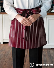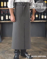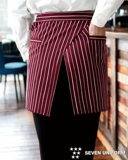 先染め変則ストライプのソムリエエプロン。92cmのロング丈に白の縦縞効果でスタイルが映えるアイテムです。 両腰ポケット(右:ソムリエナイフポケット付き)付き。織物生地の《先染めストライプ》は、濃いグランド色に白いラインのロンドンストライプに近いデザイン。生地の風合いはやや硬めで丈夫で長持ち、取り扱いも簡単なイージーケア素材です。