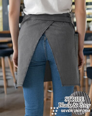 癖のない色、シックなブラック×グレーのストライプエプロンです。存在感のある縦縞ストライプで、生地感はしっかりとしたClassyな装いです。右腰ポケット(内:ペンポケット付き)。織物生地の《先染めストライプ》は、しっかりとした厚みがあり、生地の風合いは硬めで丈夫な綿リッチ素材。
