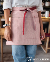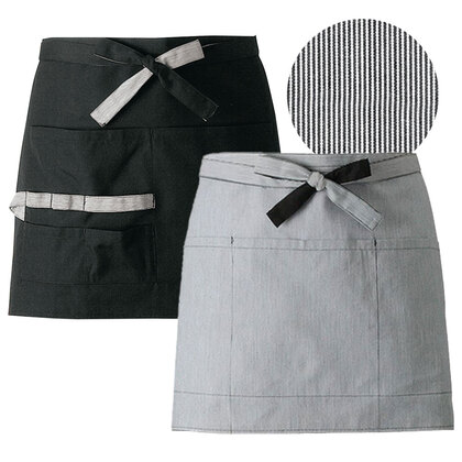 リバーシブルでご利用頂けるショートエプロンです。表はタッサー、裏はコードレーンの微細なストライプ柄♪ 表と裏、双方にフロントポケット付きで、表のポケットにはマルチなループとポケット付きで、ペン差しやハンディターミナルのストラップ留めとしてもご利用頂けます。