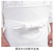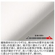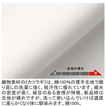 お腹まわりをしっかりガードする刺し子付きの調理前掛け。刺し子部分には共布を何枚も重ね、ミシンステッチで丁寧に縫い合わせた構造です。織物素材の《カツラギ》は、綿100%の厚手生地で繰り返しの洗濯に強く、吸汗性に優れています。縦糸の密度が高く、綾目のある表情が特徴。新品時は生地が硬めですが、洗って使い込んでいけば適度に柔らかくなり体に馴染みます。綿100%。