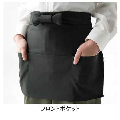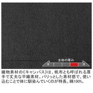 キャンバス生地を使用した、墨黒カラーのショートエプロン。白が基本とされる和エプロンですが、落ち着いた和の印象を演出する墨黒もお勧め。短めで軽快な前中心丈34cm、前ポケットは小物の収納に便利な3連ポケット仕様。織物素材の《キャンバス》は、帆布とも呼ばれる厚手で丈夫な平織素材。バリっとした素材感で、使い込むことで体に馴染んでいくのが特長。綿100%。