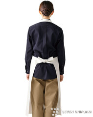 綿100%生地の調理用前掛け。選べるカラーは、落ち着いた黒(キャンバス生地)と、上品なダークブルー藍色(カツラギ)の2色。ともにユニフォーム素材の定番で綿100%、しっかりとした厚みと耐久性を備えています。ちらのカラーも、同系色の上衣と合わせることでより一体感あるスタイルに!