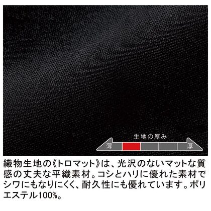 やや薄手の軽量素材、ゆったり目の女性用黒パンツ。軽快な着用感が特長の、業種を選ばないBASICアイテムです。ウェストツータック、後ろゴム、両脇ポケット付き。織物生地の《トロマット》は、光沢のないマットな質感の丈夫な平織素材。コシとハリに優れた素材でシワにもなりにくく、耐久性にも優れています。ポリエステル100%。