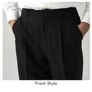 ツータックでゆったり、フォーマルな場面にふさわしい男性用黒パンツです。カシミヤ調の風合いを持つドスキン生地を採用、毛混素材に引けを取らない上質感が特長。ツータック、両脇/両後ろポケット付き。織物素材の《カシミアドスキン》は、ビロードのような光沢をもつドスキン織りで、微起毛で上質感のある風合いとしなやかな肌ざわりの高級素材。ポリエステル100%。制電素材。