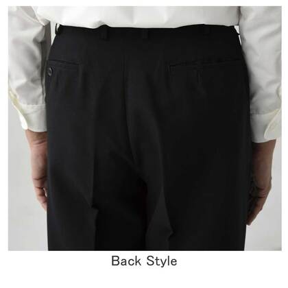 ノータックですっきり、フォーマルな場面にふさわしい男性用黒パンツです。カシミヤ調の風合いを持つドスキン生地を採用、毛混素材に引けを取らない上質感が特長。ノータック(W85㎝以上はワンタック)、両脇/両後ろポケット付き。織物素材の《カシミアドスキン》は、ビロードのような光沢をもつドスキン織りで、微起毛で上質感のある風合いとしなやかな肌ざわりの高級素材。ポリエステル100%。制電素材。