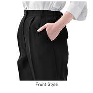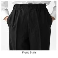 ゆったりはきやすい、男女兼用のツータックパンツです。レストランからホテルまで、業種を選ばないBAISCパンツ。ウェスト脇ゴム、ツータック、両脇/両後ろポケット付き。織物生地の《ギャバジン》は、織目がきつく丈夫に作られた綾織物。上品な光沢としっかりとした肌触りが特徴です。ポリエステル100%。