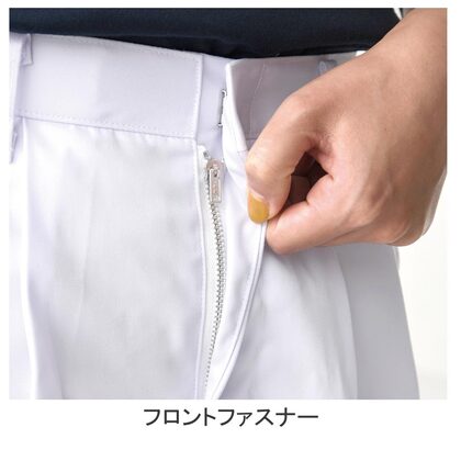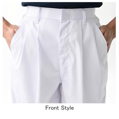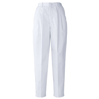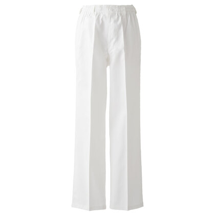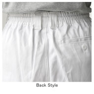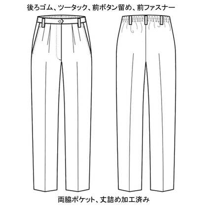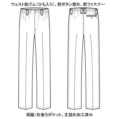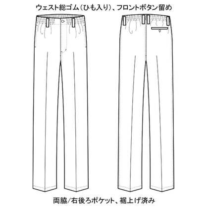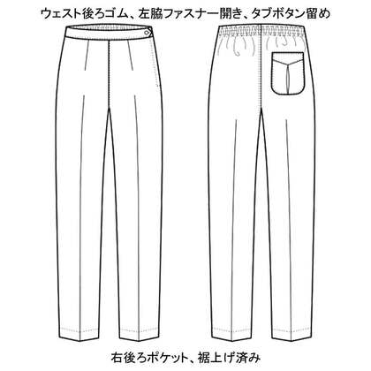 混紡のTCツイル素材にウェスト後ろゴム、ツータックでゆったりした女性用調理パンツです。ウェスト後ろゴム、前カン留め、前ファスナー、両脇/右後ポケット、裾上げ済み。織物素材の《ツイル》は、耐久性に優れた定番綾織物。シワになりにいイージーケア素材。ポリエステル65%、綿35%。抗菌防臭加工により、食中毒の原因となる黄色ブドウ球菌を抑制、また菌の増殖による悪臭も防止、洗濯を繰り返しても効果が持続します。