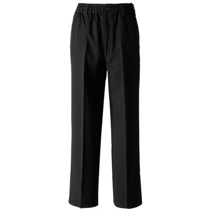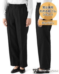 管理が楽な8サイズ展開でウェスト総ゴム(ひも入り)、男女兼用のゆったりパンツです。レストランからホテルまで、業種を選ばないBAISCパンツ。ウェスト総ゴム、ツータック、両脇/右後ろポケット付き。織物生地の《ギャバジン》は、織目がきつく丈夫に作られた綾織物。上品な光沢としっかりとした肌触りが特徴です。ポリエステル100%。ストレッチ・制電素材。