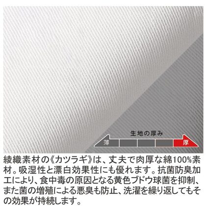 葛城綿100%、ウェスト総ゴム(ひも入り)、男女兼用の定番調理パンツです。和でも洋でも幅広くご利用頂けます。ゆったりとしたシルエット、ウェスト総ゴム、前ボタン留め、両脇/右後ポケット、裾上げ済み。織物素材の《カツラギ》は、綿100%の厚手生地で繰り返しの洗濯に強く、吸汗性に優れています。縦糸の密度が高く、綾目のある表情が特徴のスタンダード素材。綿100%。