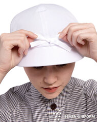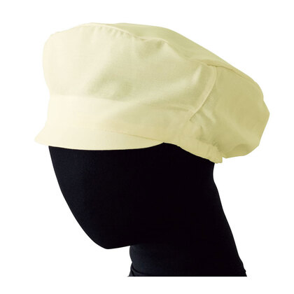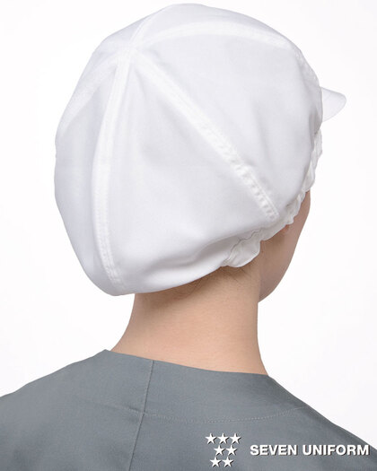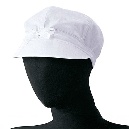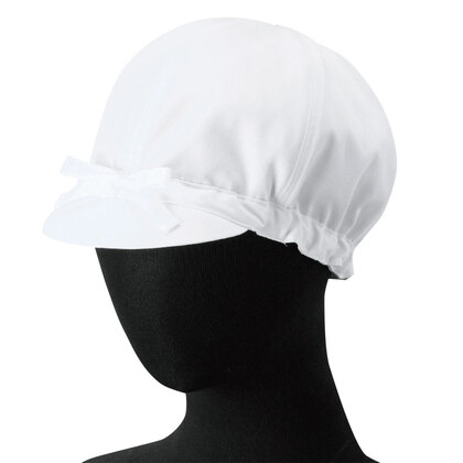 HACCP対応に、キャスケットタイプの女性用作業帽子。頭周りの調整リボンを締めることで帽子を頭にぴったりフィットさせます。バイザー芯硬め。平織素材の《タッサー》は、中厚の強度に優れたコシのある素材。横方向にはっきりとした織畝が見られるのも特徴です。ポリエステル65%、綿35%。
