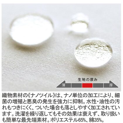 頭頂部ハードメッシュ、耳部ソフトメッシュ、抗菌防臭素材を使用した男女兼用の丸天帽。額部分に汗止めテープ付き、バイザーは硬めです。織物素材の《ナノツイル》は、ナノ単位の加工により、細菌の増殖と悪臭の発生を強力に抑制。水性・油性の汚れもつきにくく、ついた場合も落としやすく加工されています。洗濯を繰り返してもその効果は衰えず、取り扱いも簡単な最先端素材。ポリエステル65%、綿35%。