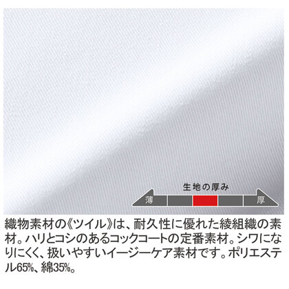 おでこの額部とタレ部分にメッシュ素材を使用した丸天帽。タレはマジックテープで正面を固定、異物の混入を防止します。バイザー芯は硬めです。織物素材の《ツイル》は、耐久性に優れた綾組織の素材。ハリとコシのあるコックコートの定番素材。シワになりにくく、扱いやすいイージーケア素材です。ポリエステル65%、綿35%。