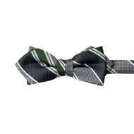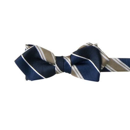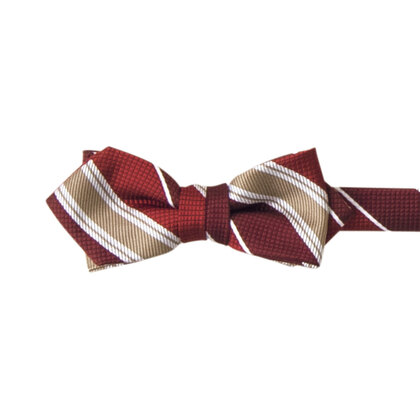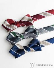 リボンの大きさ12.8×5.5㎝、レジメンタル・ストライプ柄の蝶ネクタイ。色使いと柄域がシンプルでシックなため、比較的誰にでも合わせやすく、様々なシーンで活躍します。耐久性に優れたポリエステル100%。ポリエステル100%のジャカード織りで、耐久性にも優れています。
