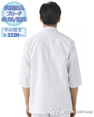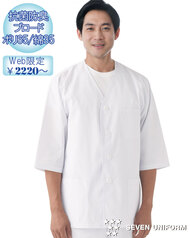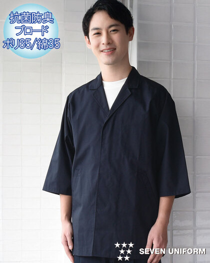 飲食店ユニフォームの最大手セブンユニフォームの男性用衿なし七分袖白衣をかなりのお値打ち価格でご紹介。品質は折り紙付きで、軽くて動きやすく、食品衛生に準拠した抗菌防臭機能付き。左胸内ポケット、両腰ポケット、後ろセンターベント仕様。織物生地の《ブロード》は、繊細な横畝が特徴の平織物です。