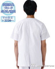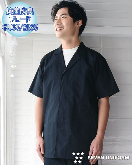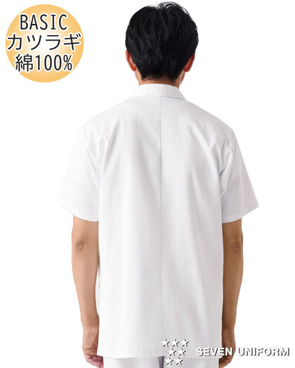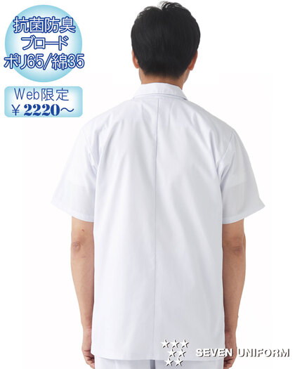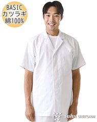 飲食店ユニフォームの最大手セブンユニフォームの男性用衿なし半袖白衣をかなりのお値打ち価格でご紹介。品質は折り紙付きで、軽くて動きやすく、食品衛生に準拠した抗菌防臭機能付き。左胸内ポケット、両腰ポケット、後ろセンターベント仕様。織物生地の《ブロード》は、繊細な横畝が特徴の平織物です。