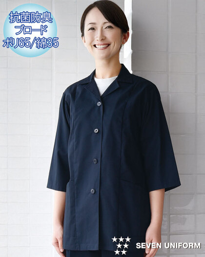 飲食店ユニフォームの最大手セブンユニフォームの女性用衿付き七分袖白衣をかなりのお値打ち価格でご紹介。品質は折り紙付きで、軽くて動きやすく、食品衛生に準拠した抗菌防臭機能付き。背中には動きやすいゆったりとしたプリーツ入り、両腰ポケット付き。織物生地の《ブロード》は、繊細な横畝が特徴の平織物。※ネイビー色は別価格となります。