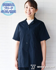 飲食店ユニフォームの最大手セブンユニフォームの女性用衿付き半袖白衣をかなりのお値打ち価格でご紹介。品質は折り紙付きで、軽くて動きやすく、食品衛生に準拠した抗菌防臭機能付き。背中には動きやすいゆったりとしたプリーツ入り、両腰ポケット付き。織物生地の《ブロード》は、繊細な横畝が特徴の平織物。※ネイビー色は別価格となります。