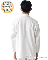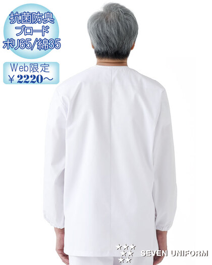 飲食店ユニフォームの最大手セブンユニフォームの男性用衿なし長袖白衣をかなりのお値打ち価格でご紹介。品質は折り紙付きで、軽くて動きやすく、食品衛生に準拠した抗菌防臭機能付き。左胸内ポケット、両腰ポケット、袖口にはオリジナルの耐熱ゴムが入っています。織物生地の《ブロード》は、繊細な横畝が特徴の平織物です。