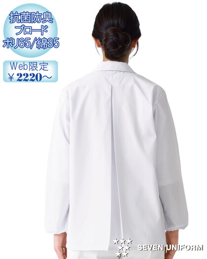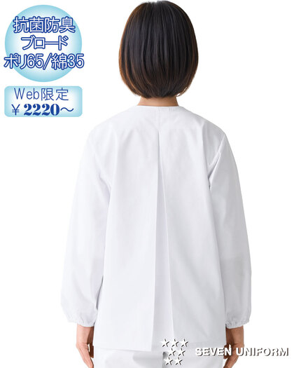 飲食店ユニフォームの最大手セブンユニフォームの女性用衿なし長袖白衣をかなりのお値打ち価格でご紹介。品質は折り紙付きで、軽くて動きやすく、食品衛生に準拠した抗菌防臭機能付き。背中には動きやすいゆったりとしたプリーツ入り、両腰ポケット付き、袖口にはオリジナルの耐熱ゴムが入っています。織物生地の《ブロード》は、繊細な横畝が特徴の平織物。ポリエステル65%、綿35%のイージーケア素材。