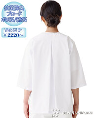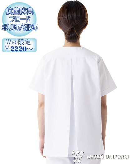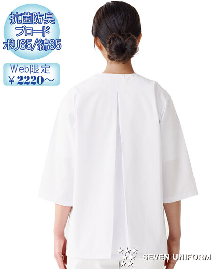飲食店ユニフォームの最大手セブンユニフォームの女性用衿なし半袖白衣をかなりのお値打ち価格でご紹介。品質は折り紙付きで、軽くて動きやすく、食品衛生に準拠した抗菌防臭機能付き。背中には動きやすいゆったりとしたプリーツ入り、両腰ポケット付き。織物生地の《ブロード》は、繊細な横畝が特徴の平織物。ポリエステル65%、綿35%のイージーケア素材。