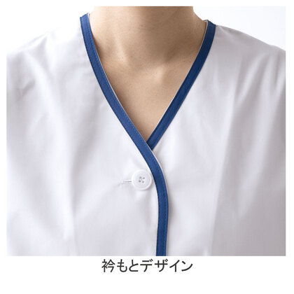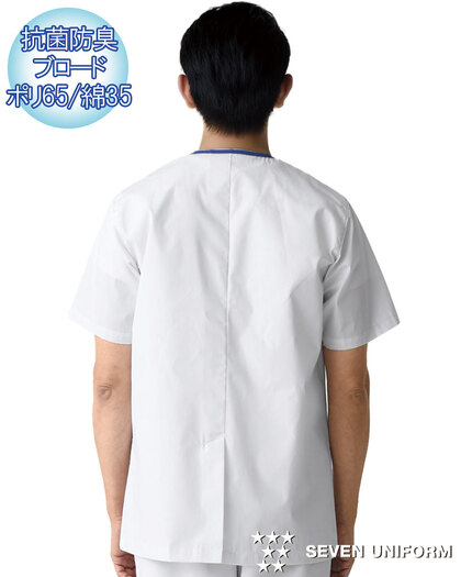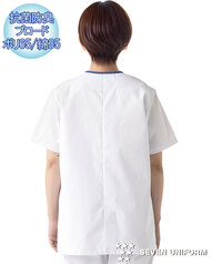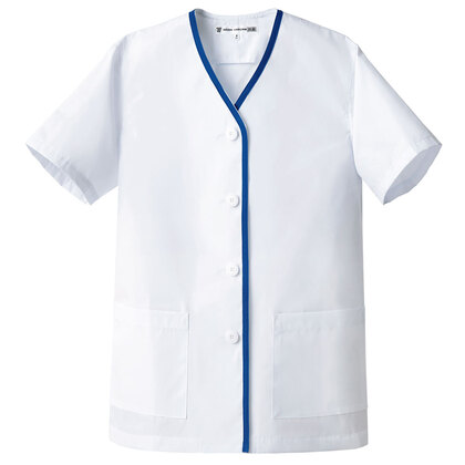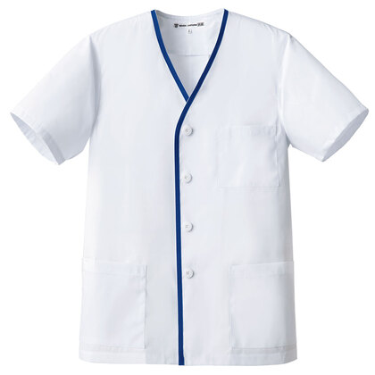 清潔感のあるブルーのラインが爽やかな半袖白衣です。抗菌防臭素材を使用しています。/両腰ポケット、後ろセンターベント仕様。織物生地の《ブロード》は、繊細な横畝が特長の平織物。薄く柔軟な衛生白衣の定番素材。ポリエステル65%、綿35%。抗菌防臭加工により、食中毒の原因となる黄色ブドウ球菌を抑制、また菌の増殖による悪臭も防止、洗濯を繰り返してもその効果が持続します。