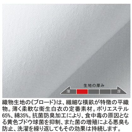 清潔感のあるブルーのラインが爽やかな長袖白衣です。抗菌防臭素材を使用しています。両腰ポケット、後ろセンターベント仕様。織物生地の《ブロード》は、繊細な横畝が特長の平織物。薄く柔軟な衛生白衣の定番素材。ポリエステル65%、綿35%。抗菌防臭加工により、食中毒の原因となる黄色ブドウ球菌を抑制、また菌の増殖による悪臭も防止、洗濯を繰り返してもその効果が持続します。