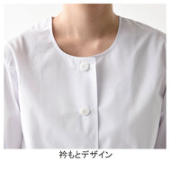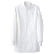 衿なし長袖のレディース白衣。抗菌防臭素材を使用しています。両腰ポケット、袖口ゴム、後ろセンターベント仕様。織物生地の《ブロード》は、繊細な横畝が特長の平織物。薄く柔軟な衛生白衣の定番素材。ポリエステル65%、綿35%。抗菌防臭加工により、食中毒の原因となる黄色ブドウ球菌を抑制、また菌の増殖による悪臭も防止、洗濯を繰り返してもその効果が持続します。