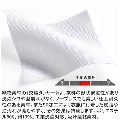 形態安定性に優れ、特殊プレスと耐久縫製で強力に補強した商品です。驚異の耐久性を是非ともお試し頂きたいタフリースシリーズ。両腰ポケット、背中プリーツ付き。織物素材の《交織タッサー》は、洗濯シワや型崩れがなく、ノープレスでも美しい仕上耐久性のある素材。またSR加工により衣服に付着した皮脂や油汚れが落ちやすく、その効果は持続します。ポリエステル90%、綿10%。工業洗濯対応、吸汗速乾素材。