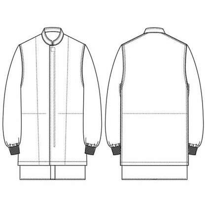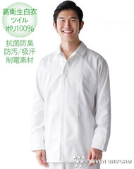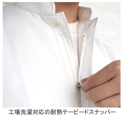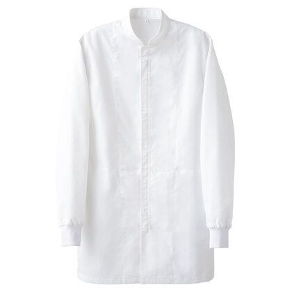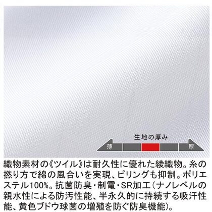 SR加工の防汚性能&綿のような心地よい風合い、スタンドカラーの高衛生白衣です。コートタイプでヒップまでをしっかり覆うので女性にもお勧め。腰にアンダーカバー、袖口はリブ仕様で、異物の混入を防止します。ポケットなし。織物素材の《ツイル》は、耐久性に優れた綾織物。糸の撚り方で綿に近い風合いを実現し、ピリングも抑制。ポリエステル100%、抗菌防臭・制電・SR加工(優れた親水性で汚れを簡単に除去出来ます)。