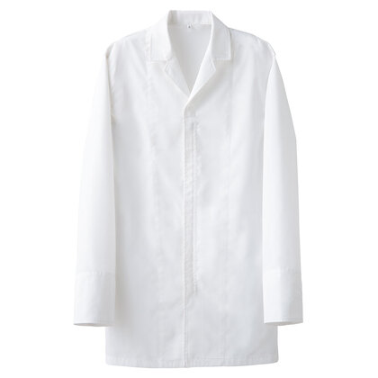 衿なし長袖のレディース白衣。抗菌防臭素材を使用しています。両腰ポケット、後ろセンターベント仕様。織物生地の《ブロード》は、繊細な横畝が特長の平織物。薄く柔軟な衛生白衣の定番素材。ポリエステル65%、綿35%。抗菌防臭加工により、食中毒の原因となる黄色ブドウ球菌を抑制、また菌の増殖による悪臭も防止、洗濯を繰り返してもその効果が持続します。