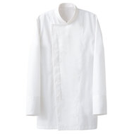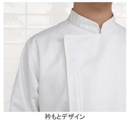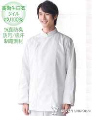 SR加工による防汚性能&綿のような心地よい風合い、コックコート仕様の高衛生白衣です。着丈はヒップまでをしっかり覆うので女性にもお勧め。袖口はネット付きで体毛などの異物混入を防止します。ポケットなし。織物素材の《ツイル》は、耐久性に優れた綾織物。糸の撚り方で綿に近い風合いを実現し、ピリングも抑制。ポリエステル100%、抗菌防臭・制電・SR加工(優れた親水性で汚れを簡単に除去出来ます)。