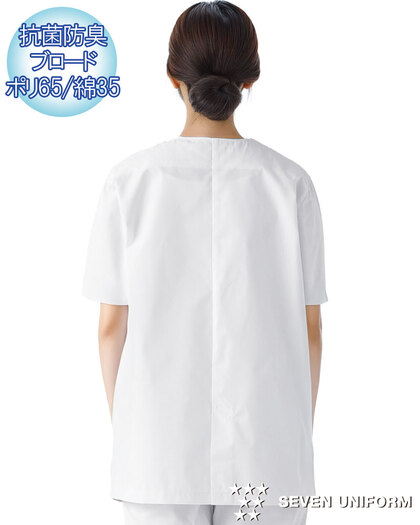 清潔感のあるブルーのラインが爽やかな半袖白衣です。抗菌防臭素材を使用しています。左胸/両腰ポケット、後ろセンターベント仕様。織物生地の《ブロード》は、繊細な横畝が特長の平織物。薄く柔軟な衛生白衣の定番素材。ポリエステル65%、綿35%。抗菌防臭加工により、食中毒の原因となる黄色ブドウ球菌を抑制、また菌の増殖による悪臭も防止、洗濯を繰り返してもその効果が持続します。