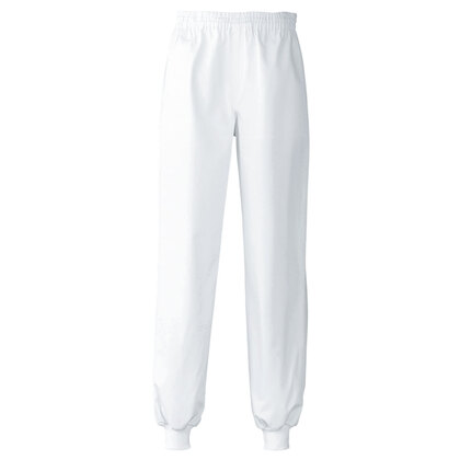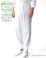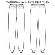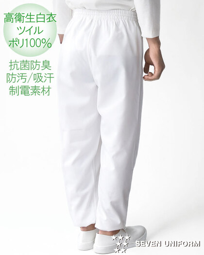 SR加工による防汚性能&綿のような心地よい風合い、高衛生仕様のホッピングパンツです。ウェスト総ゴム(ひも入り)、裾口はリブ仕様で異物混入を防ぎます。ポケットなし。織物素材の《ツイル》は、耐久性に優れた綾織物。糸の撚り方で綿に近い風合いを実現し、ピリングも抑制。ポリエステル100%、抗菌防臭・制電・SR加工(優れた親水性で汚れを簡単に除去出来ます)。