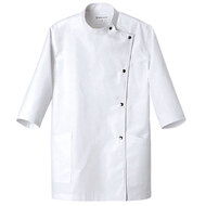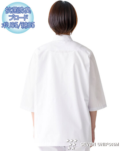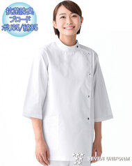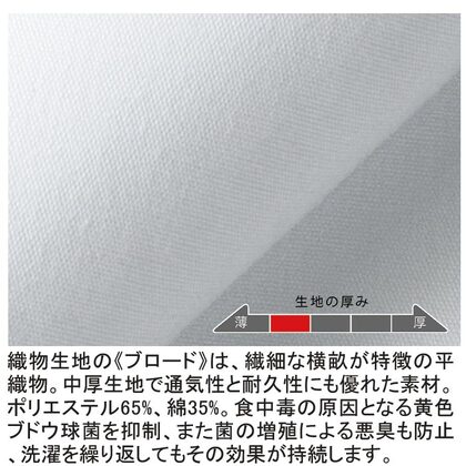 メディカルタイプのデザインに七分袖、薄地の抗菌生地を使用した衛生白衣。金属製のドットボタンがアクセントで、薬局、美容、給食白衣と幅広く利用されています。両腰ポケット(右:ペン差し)付き。織物生地の《ブロード》は、繊細な横畝が特長の平織物。ポリエステル65%、綿35%。抗菌防臭加工により、食中毒の原因となる黄色ブドウ球菌を抑制、また菌の増殖による悪臭も防止、洗濯を繰り返してもその効果が持続します。